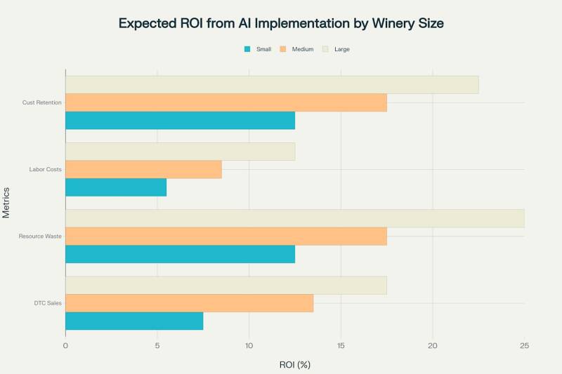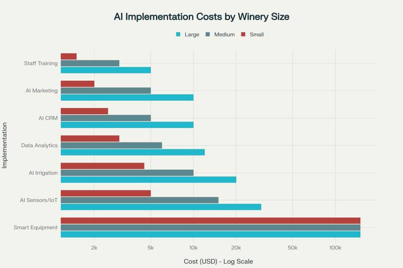 Grote wijnbedrijven kunnen uitgebreide AI-ecosystemen implementeren die wijngaardbeheer, productieoptimalisatie en marktanalyse integreren. Hoewel de initiële investeringen kunnen oplopen tot € 50.000 - € 100.000, maakt de schaal van de activiteiten een snelle terugverdientijd mogelijk door efficiëntieverbeteringen en omzetgroei. Deze wijnhuizen behalen consequent het hoogste rendement, met een stijging van de DTC-verkoop van 15-20% en een vermindering van de verspilling van hulpbronnen met 20-30%.