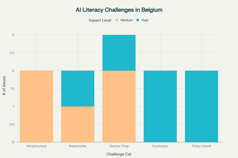 De implementatie van AI-onderwijs in België wordt geconfronteerd met meerdere onderling verbonden uitdagingen die variëren naargelang de regio en de groep belanghebbenden. Beleidscoördinatie vormt de grootste uitdaging met de grootste impact, aangezien de federale structuur van België coördinatie vereist tussen nationale, regionale en lokale overheden met verschillende bevoegdheden en prioriteiten.