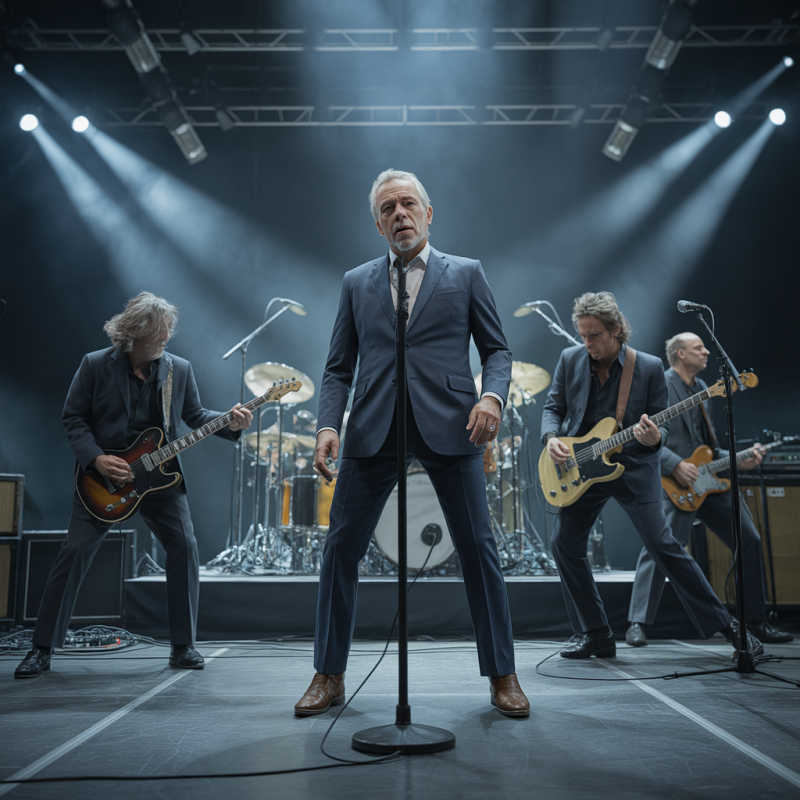 Frank Boeijen met zijn "ijzersterke liveband" – Ton Snijders op toetsen, Peter van Benthem en Ger Hoeijmakers op gitaar, Mark Stoop op drums en Charles Nagtzaam op bas. Vakmannen, zonder twijfel. Maar wat ze speelden was pure jaren tachtig, en niet op de nostalgisch-mooie manier. Die gitaren! Ze gilden en knarsten alsof ze probeerden het geluid van de regen buiten te overstemmen. Het was als luisteren naar een tribute band, alleen was het de originele artiest zelf die zijn eigen muziek covert.
